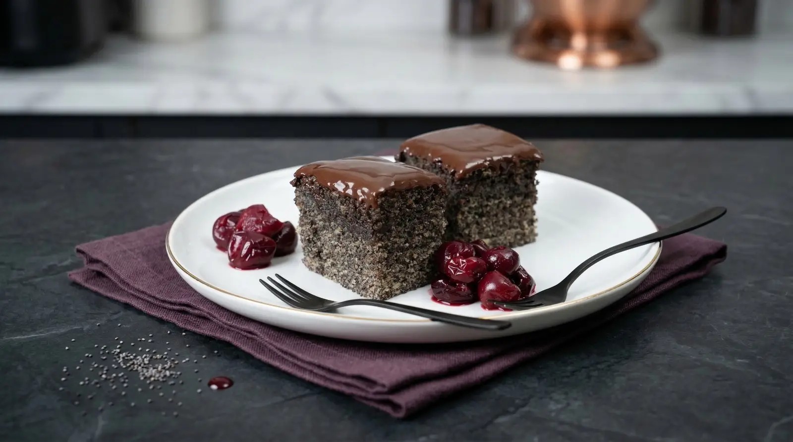 Kolač sa makom, čokoladom i višnjama je jednostavan domaći desert koji se priprema brzo, a oduševljava bogatim ukusom i sočnom teksturom. Mekana i vazdušasta korica sa mlevenim makom savršeno se slaže sa glatkom čokoladnom glazurom, pa je ovaj recept idealan izbor za porodični ručak, goste ili svakodnevno posluženje uz kafu. Ako tražite provereni recept za kolač sa makom, ovaj sočni kolač sa čokoladom je pravi izbor.
